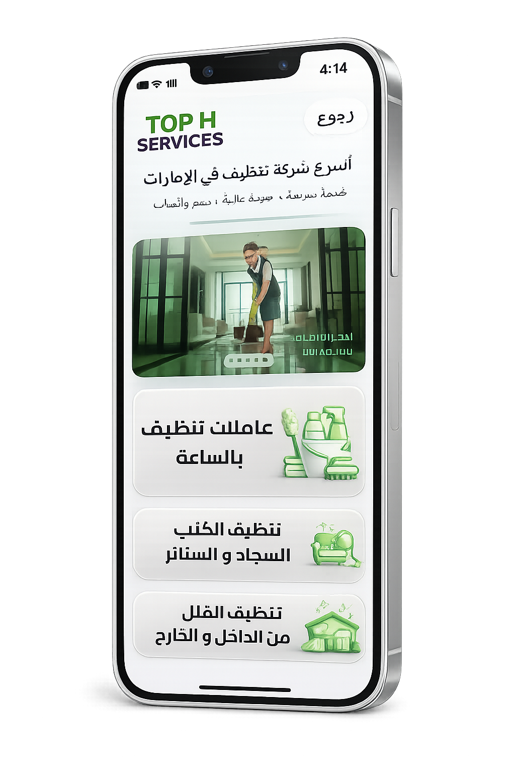 شركة توب اتش , هي من كبرى شركات خدمات التنظيف فى الإمارات. المتخصصة فى مجال نظافة الواجهات الزجاجية والرخامية والكلادنج . ذلك بأستخدام مواد متطورة على سبيل المثال ( الاسبيدرمان ) وكذلك السقالات . والسلالم الجرارة . في نهاية الأمر تعد شركة توب أتش و هي من كبري شركات النظافة الداخلية ( Housekeeping ) وكما نقوم بتنظيف المنازل و الفلل ومكافحة الحشرات وأيضا غسيل السيارات المتنقل. كذلك تطهير خطوط الهود و Fresh Air (الخزانات) وتنسيق الحدائق ومكافحة الحشرات . والقوارض للشقق والفيلات والشركات . من ثم المنشآت الخاصة والعامة.